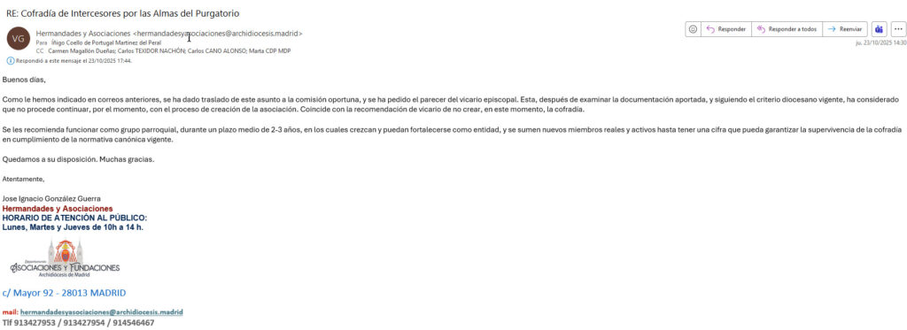 Como le hemos indicado en correos anteriores, se ha dado traslado de este asunto a la comisión oportuna, y se ha pedido el parecer del vicario episcopal. Esta, después de examinar la documentación aportada, y siguiendo el criterio diocesano vigente, ha considerado que no procede continuar, por el momento, con el proceso de creación de la asociación. Coincide con la recomendación de vicario de no crear, en este momento, la cofradía.